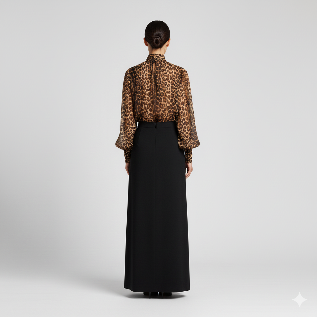 Son col classique et sa coupe élégante s’adaptent à toutes les morphologies, tandis que ses manches longues assurent une allure pudique et raffinée. Associé à une jupe longue unie (plissée, en satin ou en jean), il crée un contraste sophistiqué qui attire le regard avec subtilité.