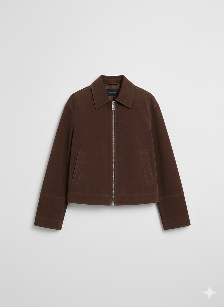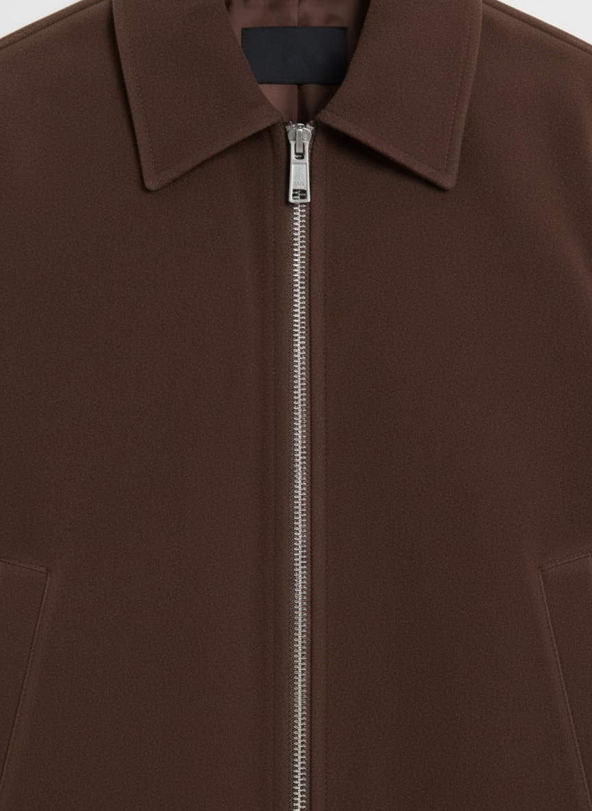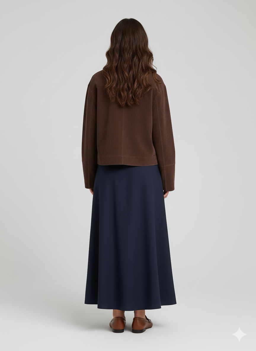 Cette veste courte en laine brun chocolat profond incarne la sobriété chic et le raffinement discret.