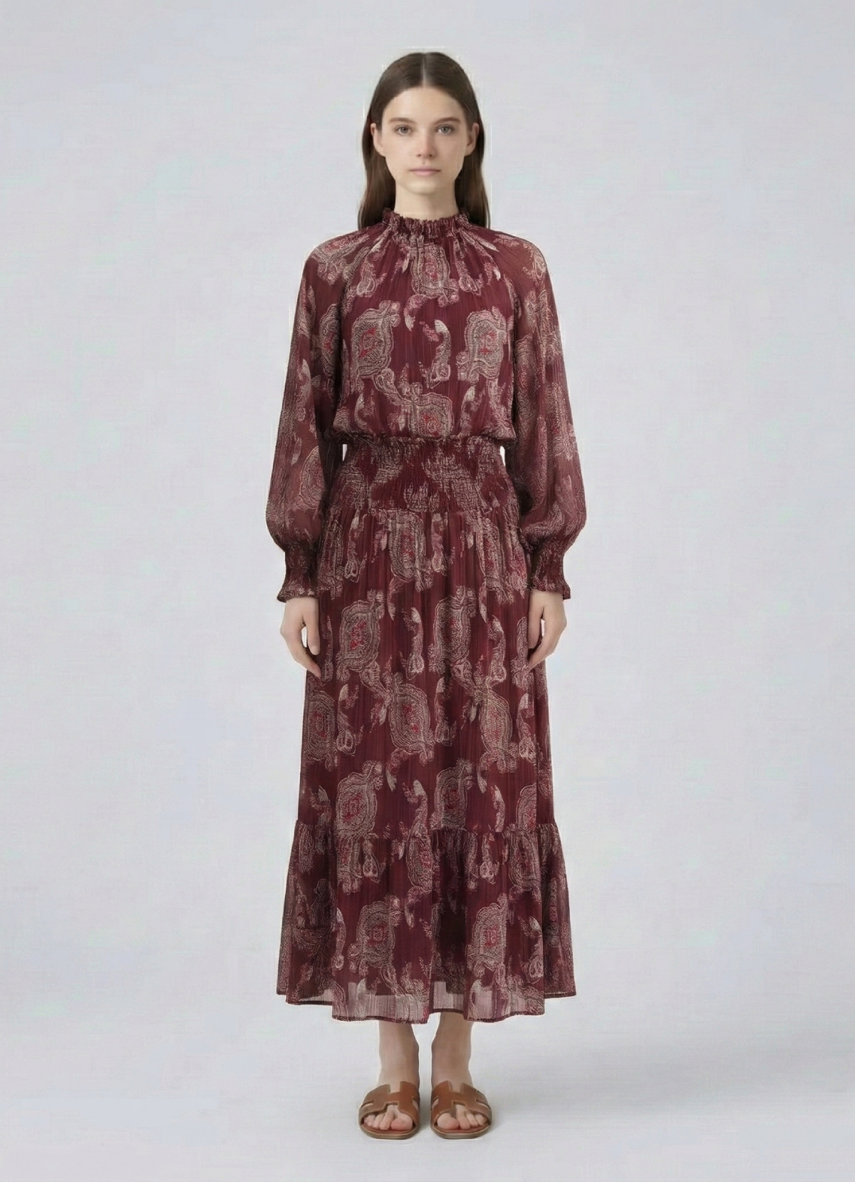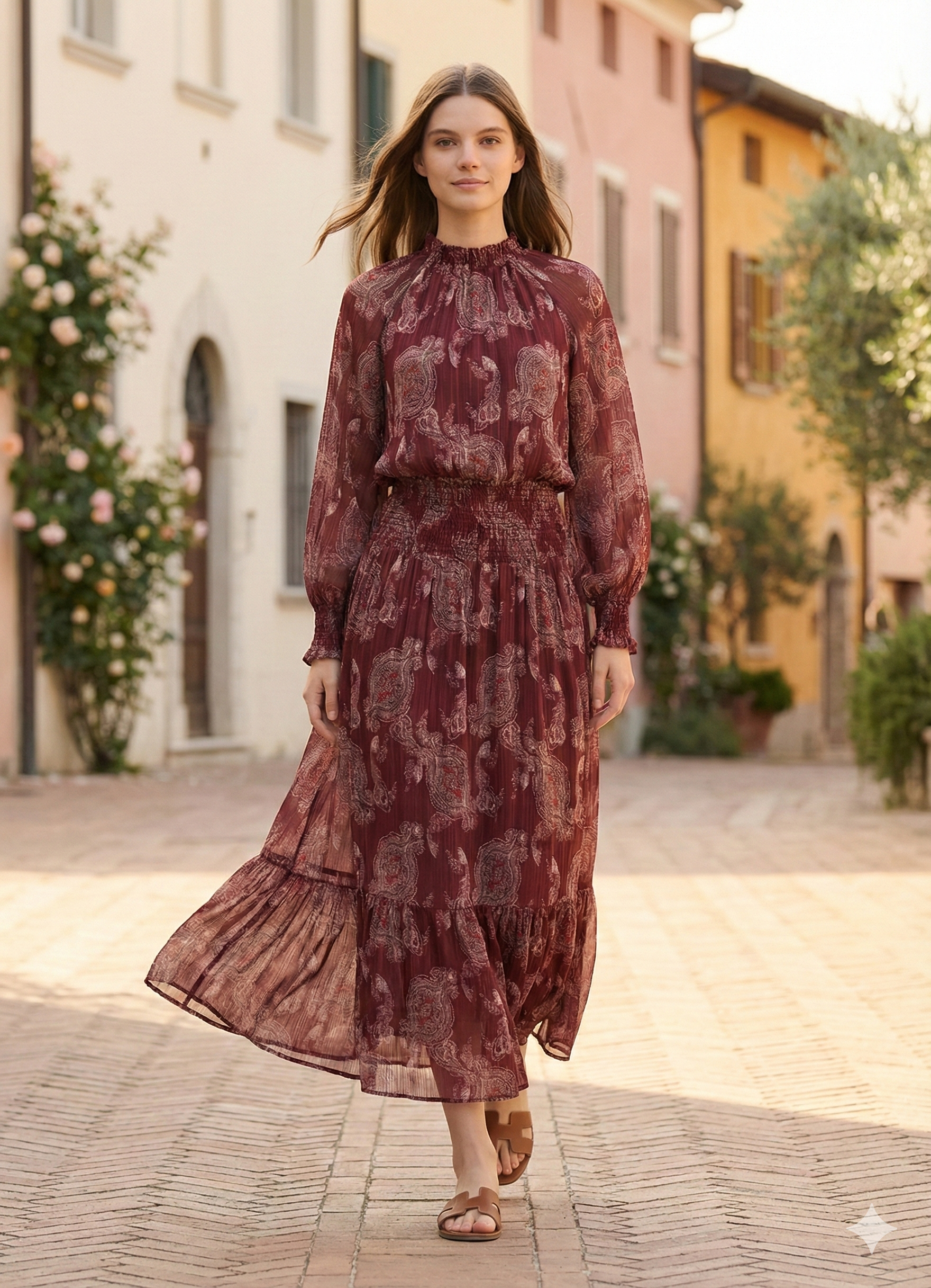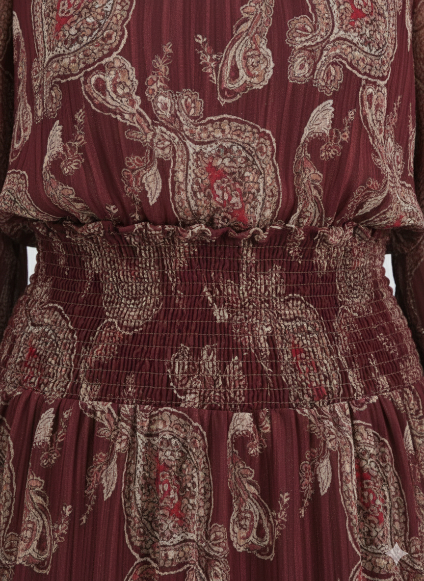 Cette robe longue fluide au motif fleur bordeaux et rose allie confort et style bohème chic.