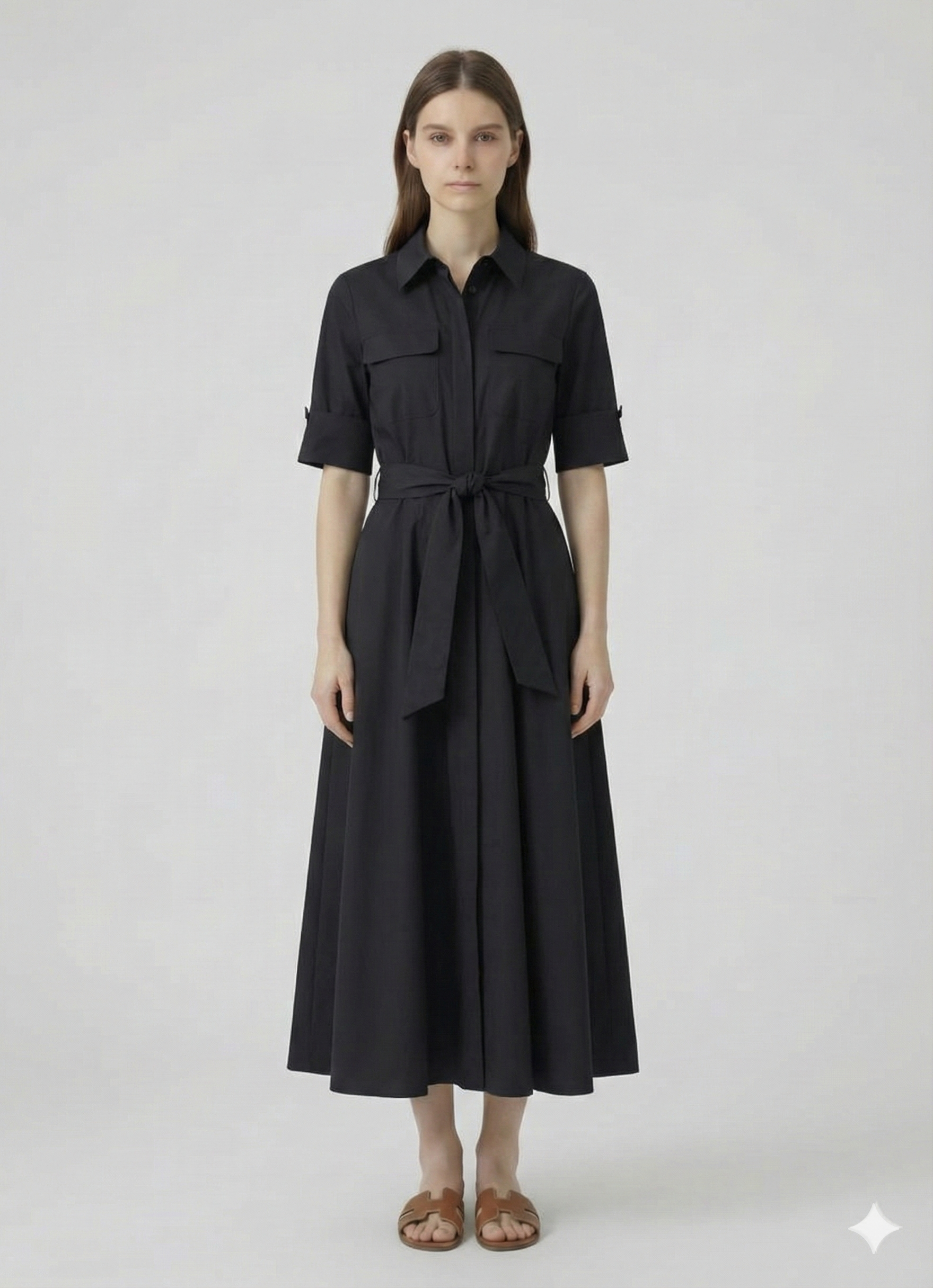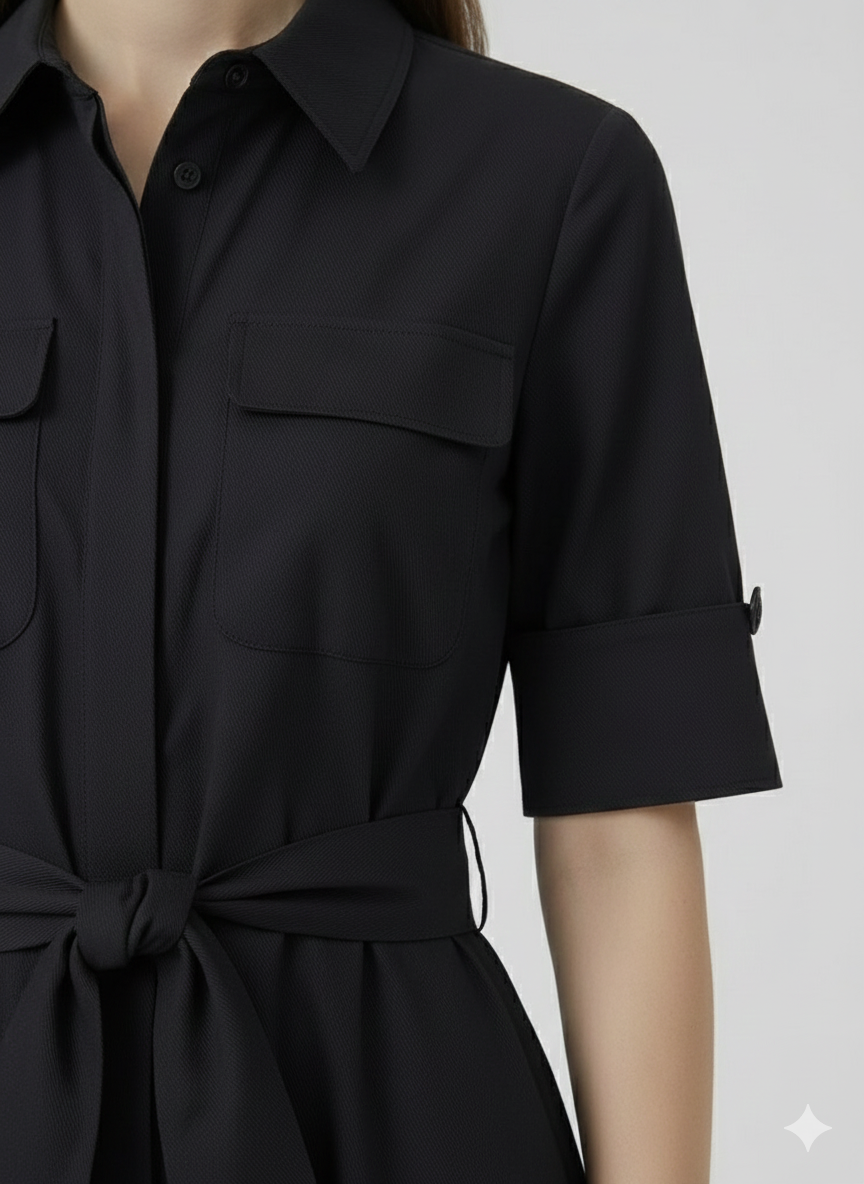 Son col chemise classique, ses manches courtes et sa ceinture assortie soulignent élégamment la taille tout en conservant un style sobre et raffiné. Les poches décoratives sur la poitrine ajoutent une touche moderne et pratique.